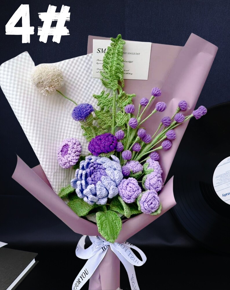 We will put the crocheted flowers and the wrapping paper required for the bouquet into the carton at the same time. After receiving the goods, you can pack them into the style and type you like. Or you can choose not to pack them and simply insert them into the vase to create a flower arrangement, which is also a very good way.